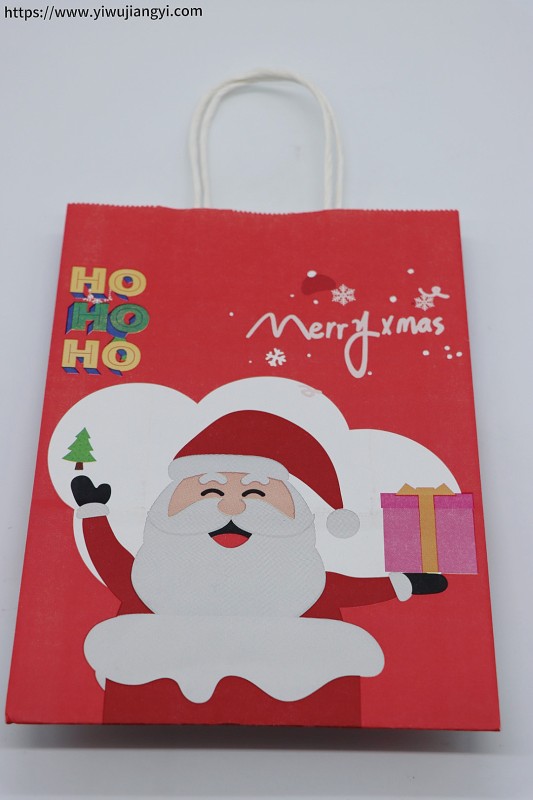 Christmas color-blocking Santa Claus red kraft paper tote bag. The red and blue color-blocking design is novel and eye-catching. The front is printed with a cartoon Santa Claus and the words "Merry Xmas". The sides are decorated with Christmas ball and Christmas tree patterns. It has a creative Christmas style. The thickened kraft paper has good load-bearing capacity, suitable for various Christmas gift packaging.