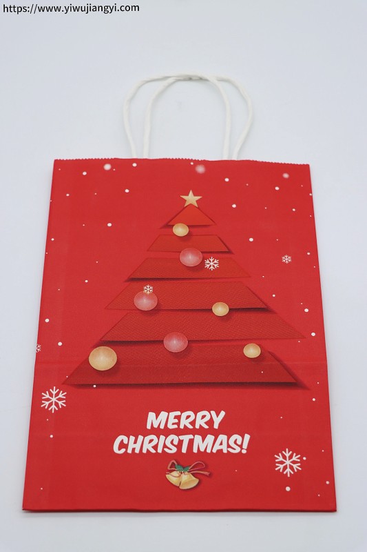 Christmas 3D Christmas Tree Red Kraft Paper Tote Bag, with a bright red background paired with a 3D embossed Christmas tree shape, printed with the white English words "Merry Christmas". It features a simple and elegant Christmas design, made of thickened kraft paper which is strong and wear-resistant, making it a high-quality choice for high-end Christmas gift packaging. Christmas 3D